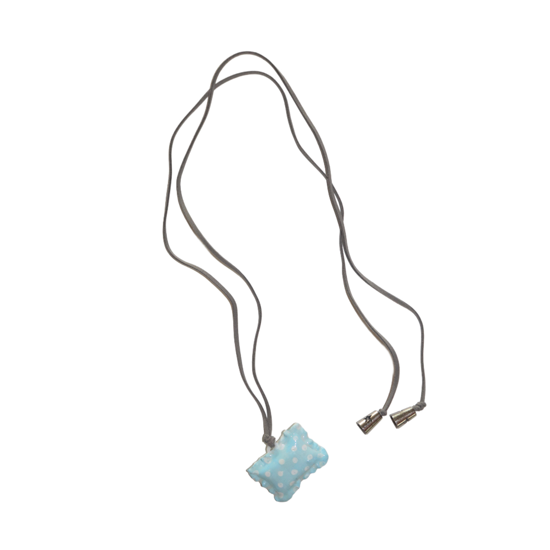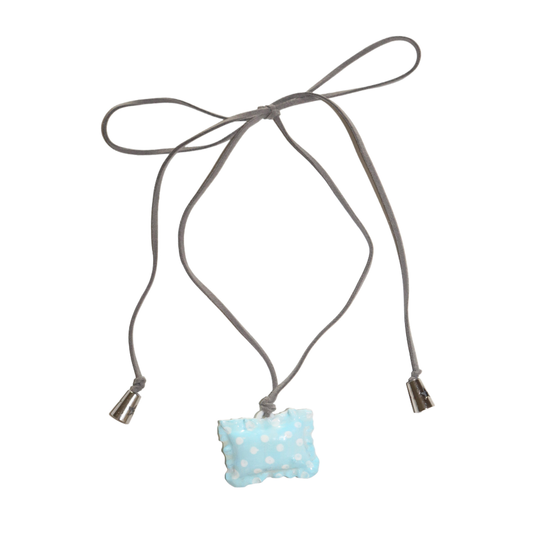 펜던트는 연하늘빛 컬러로 직접 페인팅되었으며, 도트 패턴 디테일이 더해져 개체마다 조금씩 다른 매력을 지닌 원앤온리 아이템입니다.