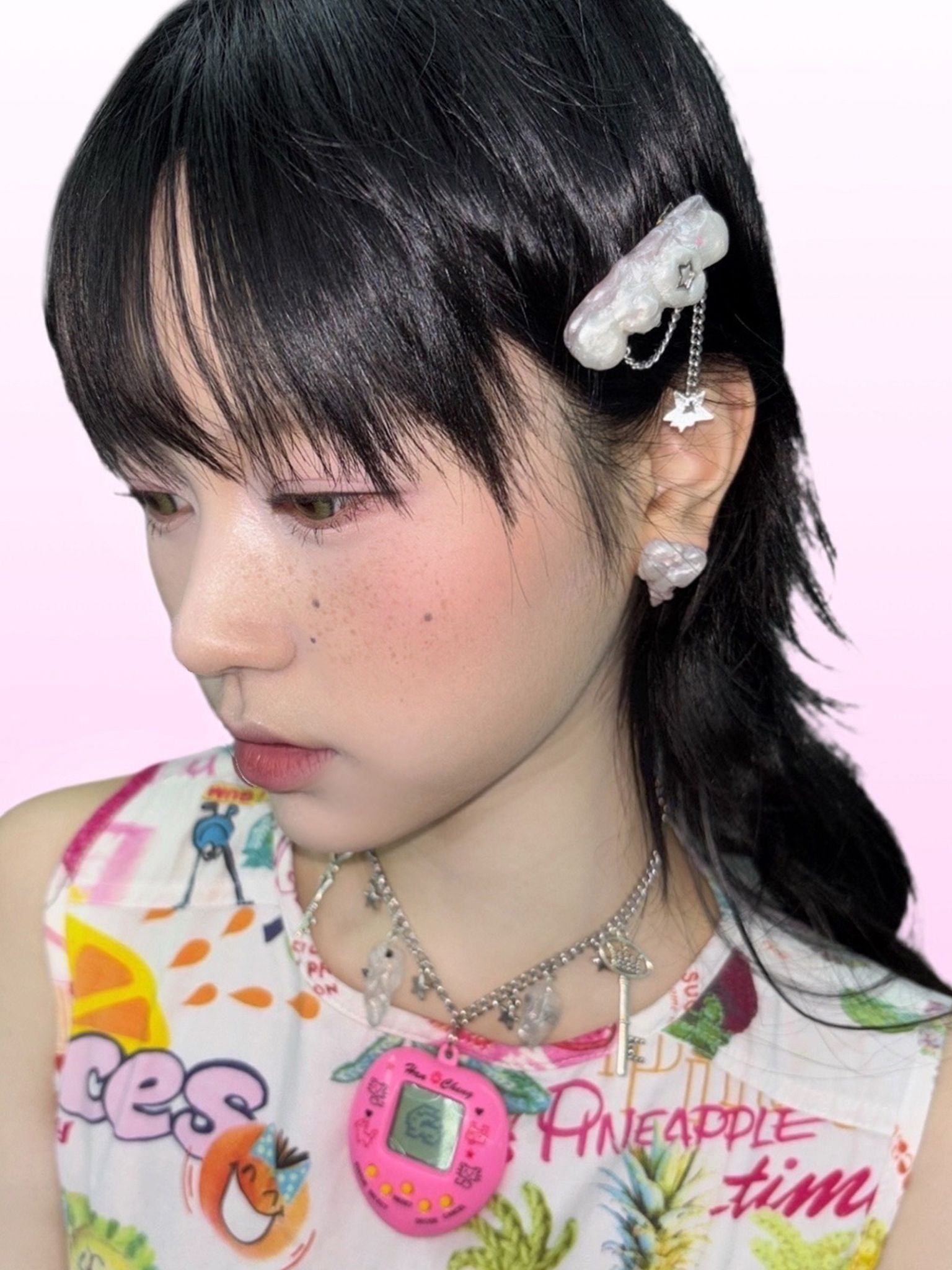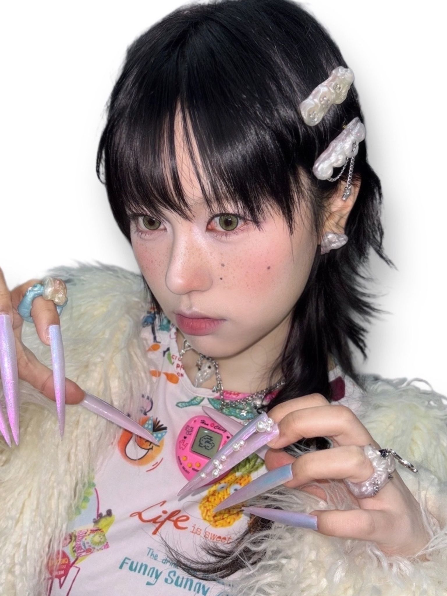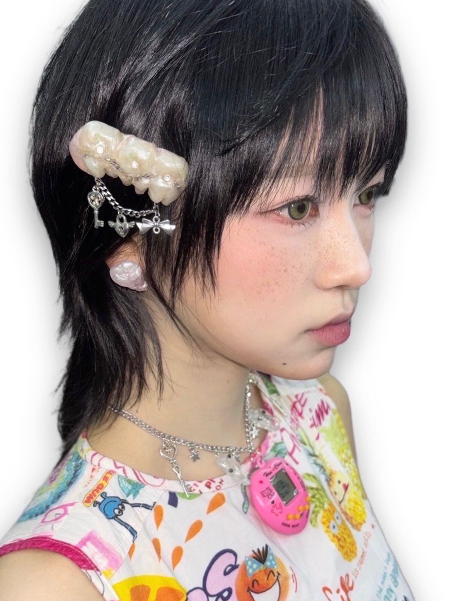 이빨 모양을 하트로 재해석하여 귀엽고 키치한 무드를 연출합니다.